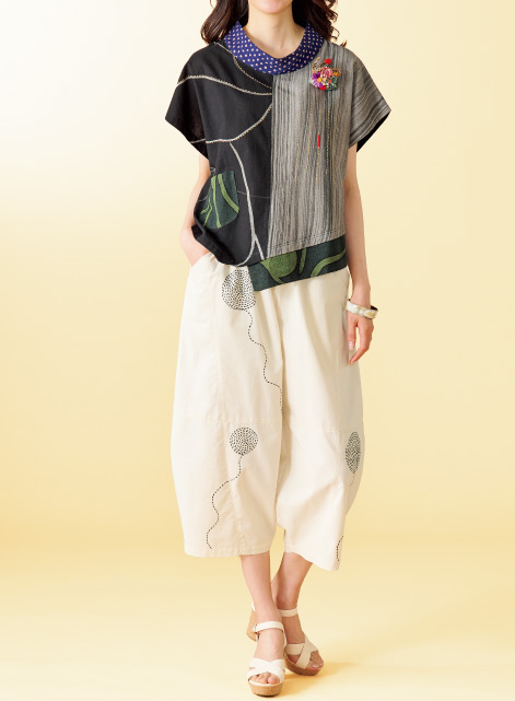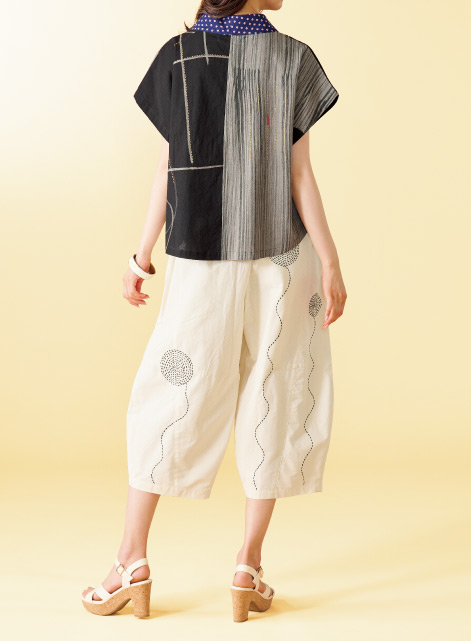 バルーンシルエットが脚のラインをおしゃれにカバー。軽快な短め丈が夏にぴったりのパンツです。ユニークな刺し子の柄で遊び心をプラスしました。