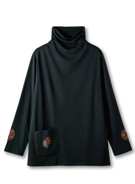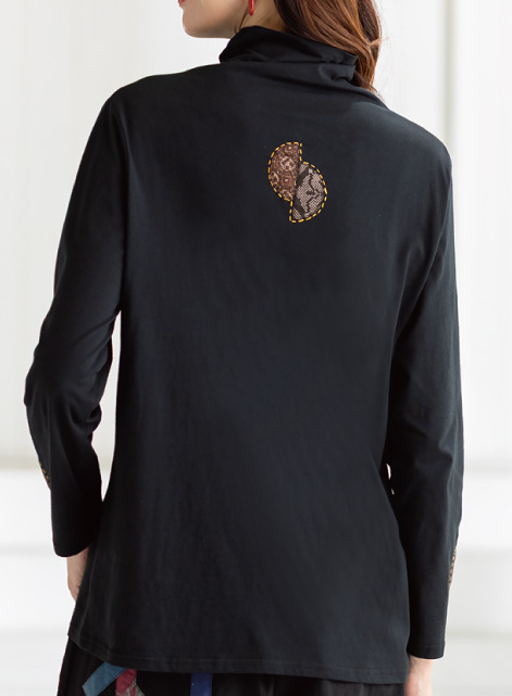 大島紬のパッチワークをアクセントに使った、和モダンテイストのTシャツ。ポケットにはレースも加えて可愛らしい印象に。おしゃれの幅が広がるアフリカ珊瑚のネックレス付きです。