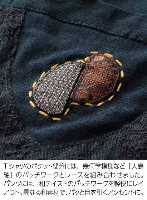 Tシャツのポケット部分には、幾何学模様など「大島紬」のパッチワークとレースを組み合わせました。パンツには、和テイストのパッチワークを軽快にレイアウト。異なる和素材で、パッと目を引くアクセントに。