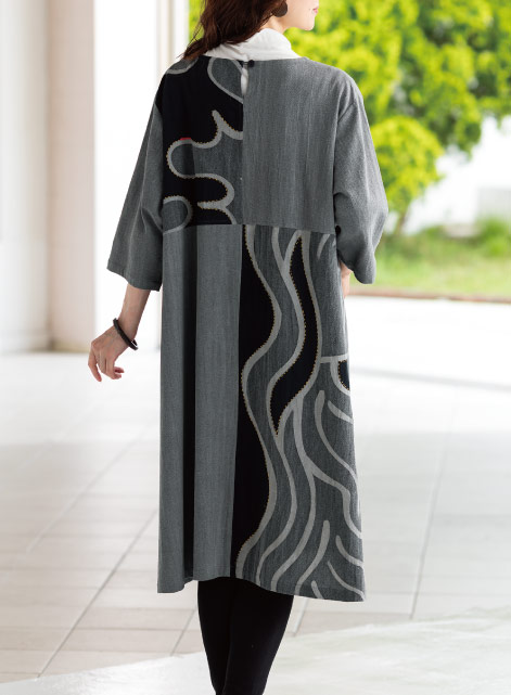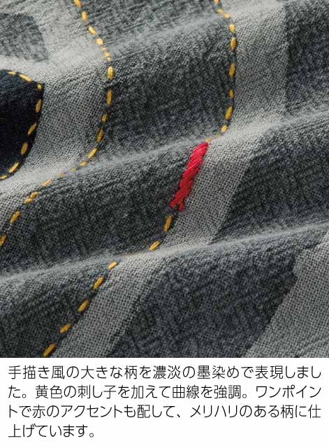 手描き風の大きな柄を濃淡の墨染めで表現しました。黄色の刺し子を加えて曲線を強調。ワンポイントで赤のアクセントも配して、メリハリのある柄に仕上げています。