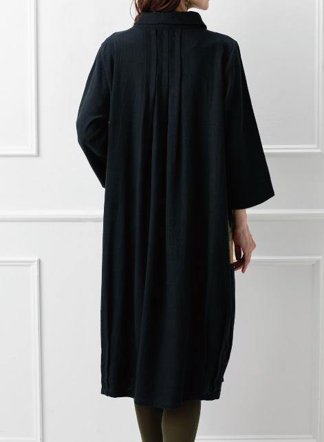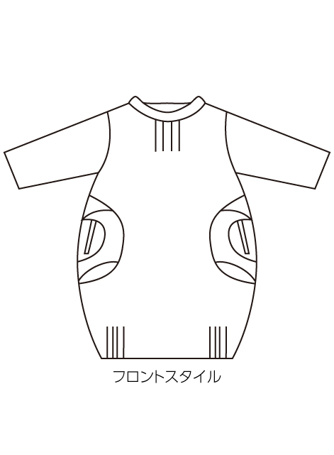 襟もとと裾にタック入りのバルーンシルエット。ボリュームが気になるポイントを色柄でカバー。中にハイネックを着ても素敵です。