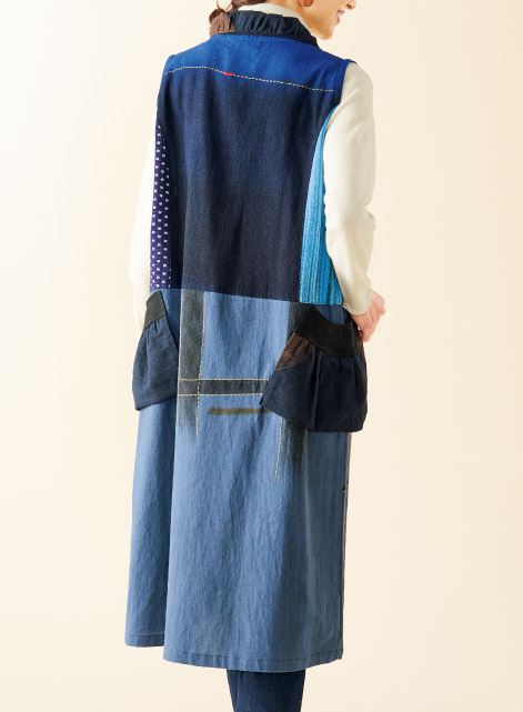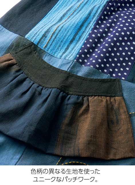 斬新なパッチワーク使いがすらりと腰高の印象に。タック使いのふんわり襟がお顔回りを優しく包み、立体的なポケットが個性のある装いを演出します。