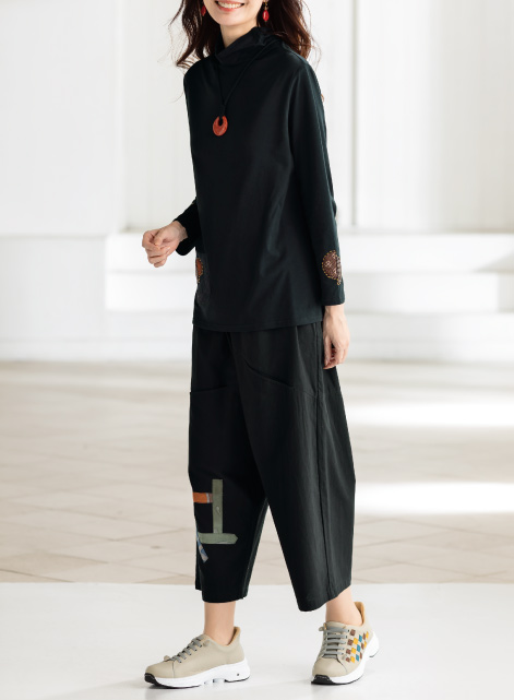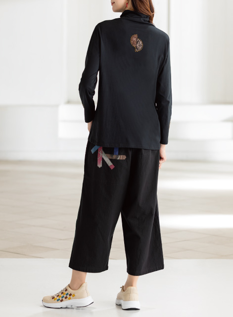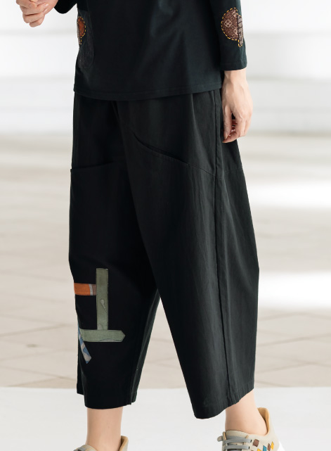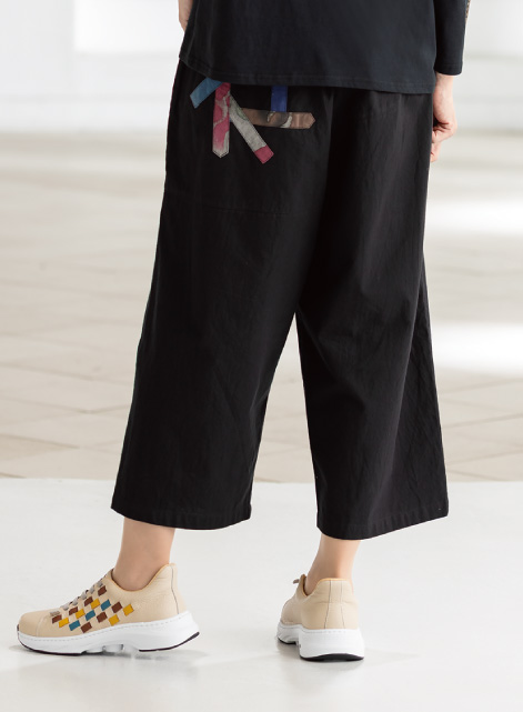 丸みのあるゆったりパンツ。和テイストの生地を組み合わせたパッチワークで、遊び心と動きのあるデザインに。ウエストは総ゴム仕様で楽ちんです。